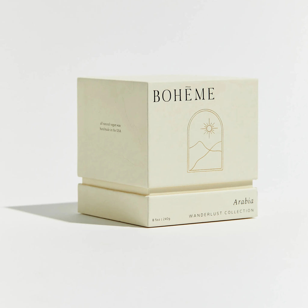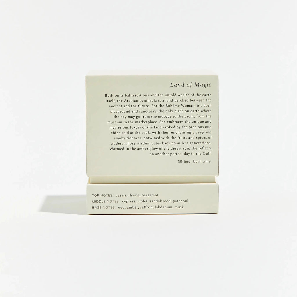 Built on tribal traditions and the untold wealth of the earth itself, the Arabian peninsula is a land perched between the ancient and the future. For the Bohéme Woman, it’s both playground and sanctuary, the only place on earth where the day may go from the mosque to the yacht, from the museum to the marketplace. She embraces the unique and mysterious luxury of the land evoked by the precious oud chips sold at the souk, with their enchantingly deep and smoky richness, entwined with the fruits and spices of traders whose wisdom dates back countless generations. Warmed in the amber glow of the desert sun, she reflects on another perfect day in the Gulf. 100% all-natural vegan wax, 50-hour burn time, 8.5oz / 240g