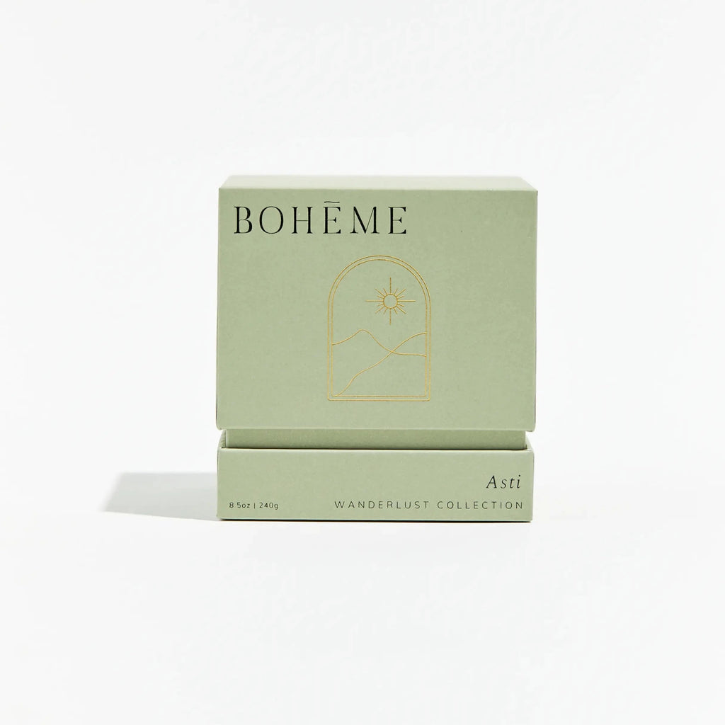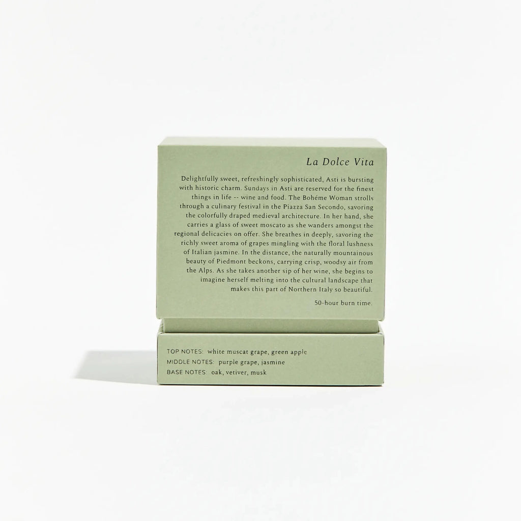 Delightfully sweet, refreshingly sophisticated, Asti is bursting with historic charm. Sundays in Asti are reserved for the finest things in life -- wine and food. The Bohéme Woman strolls through a culinary festival in the Piazza San Secondo, savoring the colorfully draped medieval architecture. In her hand, she carries a glass of sweet Moscato as she wanders amongst the regional delicacies on offer. She breathes in deeply, savoring the richly sweet aroma of grapes mingling with the floral lushness of Italian jasmine. In the distance, the natural mountainous beauty of Piedmont beckons, carrying crisp, woodsy air from the Alps. As she takes another sip of her wine, she begins to imagine herself melting into the cultural landscape that makes this part of Northern Italy so beautiful. 100% all-natural vegan wax, 50-hour burn time, 8.5oz / 240g