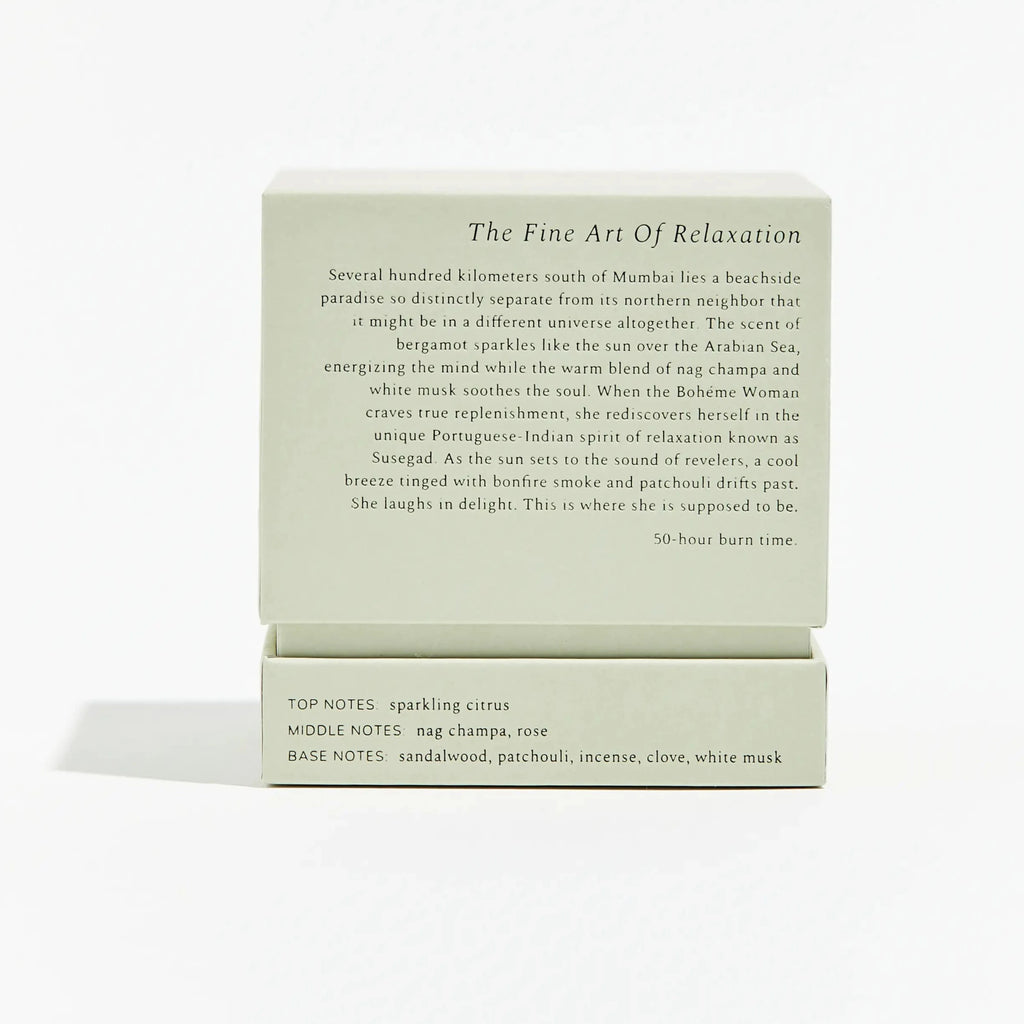 Several hundred kilometers south of Mumbai lies a beachside paradise so distinctly separate from its northern neighbor that it might be in a different universe altogether. The scent of bergamot sparkles like the sun over the Arabian Sea, energizing the mind while the warm blend of nag champa and white musk soothes the soul. When the Bohéme Woman craves true replenishment, she rediscovers herself in the unique Portuguese-Indian spirit of relaxation known as Susegad. As the sun sets to the sound of revelers, a cool breeze tinged with bonfire smoke and patchouli drifts past. She laughs in delight. This is where she is supposed to be.