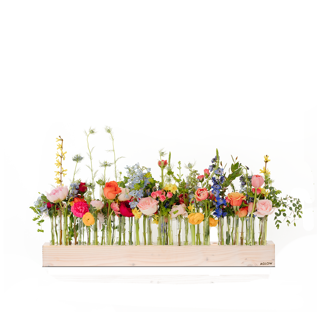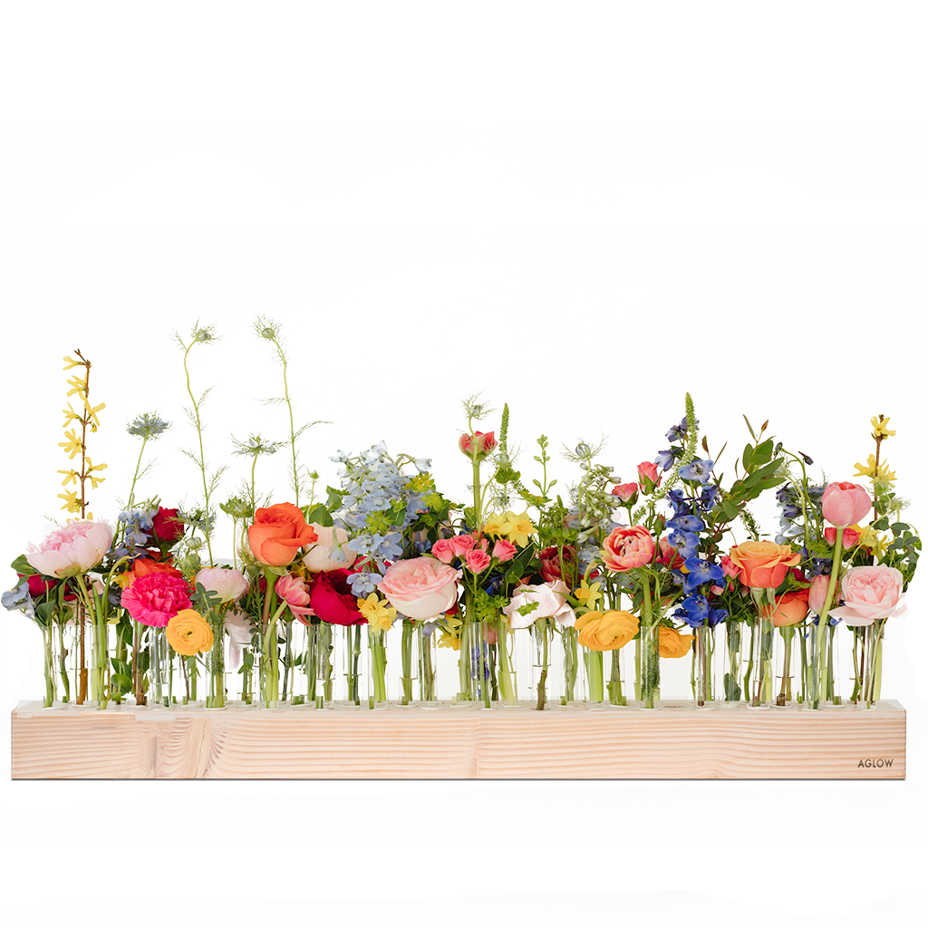 Short custom glass vials to accompany your Aglow wood base. Design to work for tablescapes, allowing you to see and talk to people across the table.
