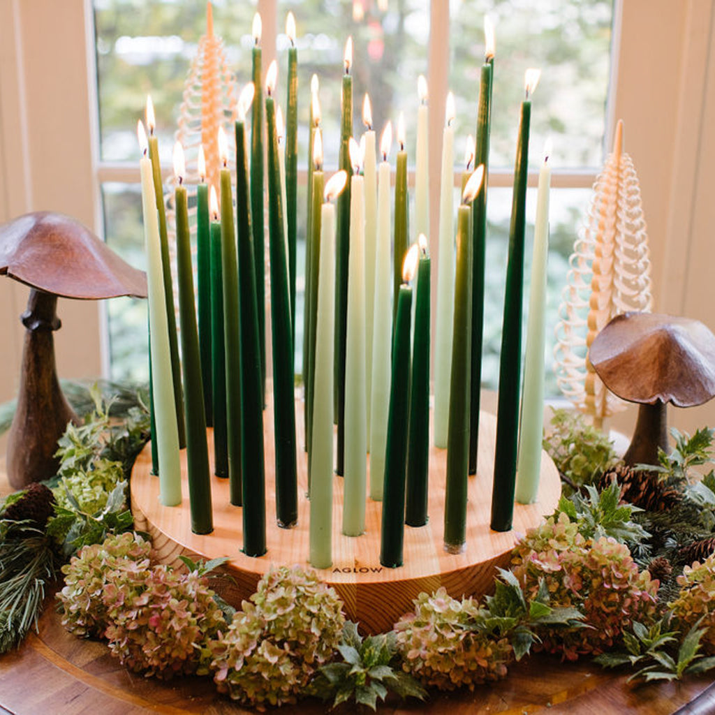 ~18in diameter x 2.5in high wood base with slots for 38 taper candles.